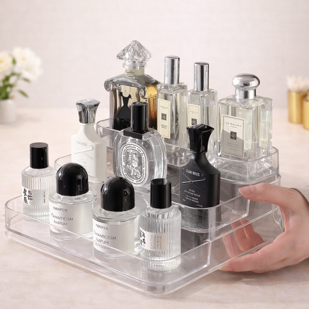 Capacidade: Ideal para perfumes, frascos de cosméticos, maquiagens e pequenos acessórios